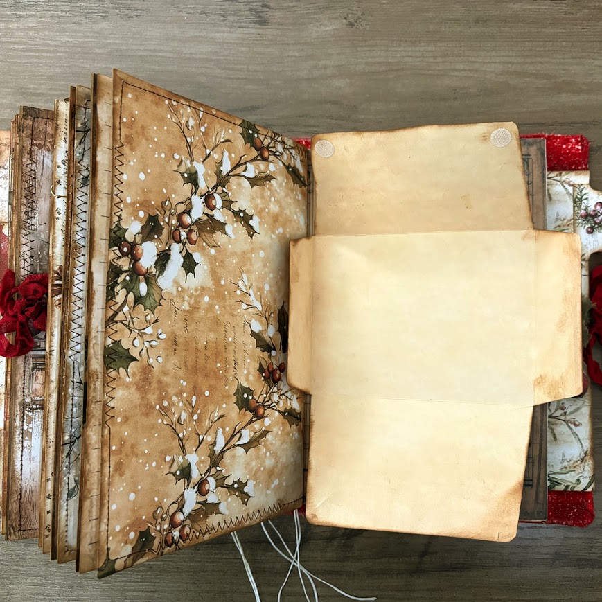 This process is very similar to what we did in Part 4, but today we’re taking things a step further by exploring fresh and unique ways to use the kit ephemera you already have. I’ll show you how to add double pockets and envelopes that not only look sweet and festive, but also provide plenty of extra writing space throughout the journal.